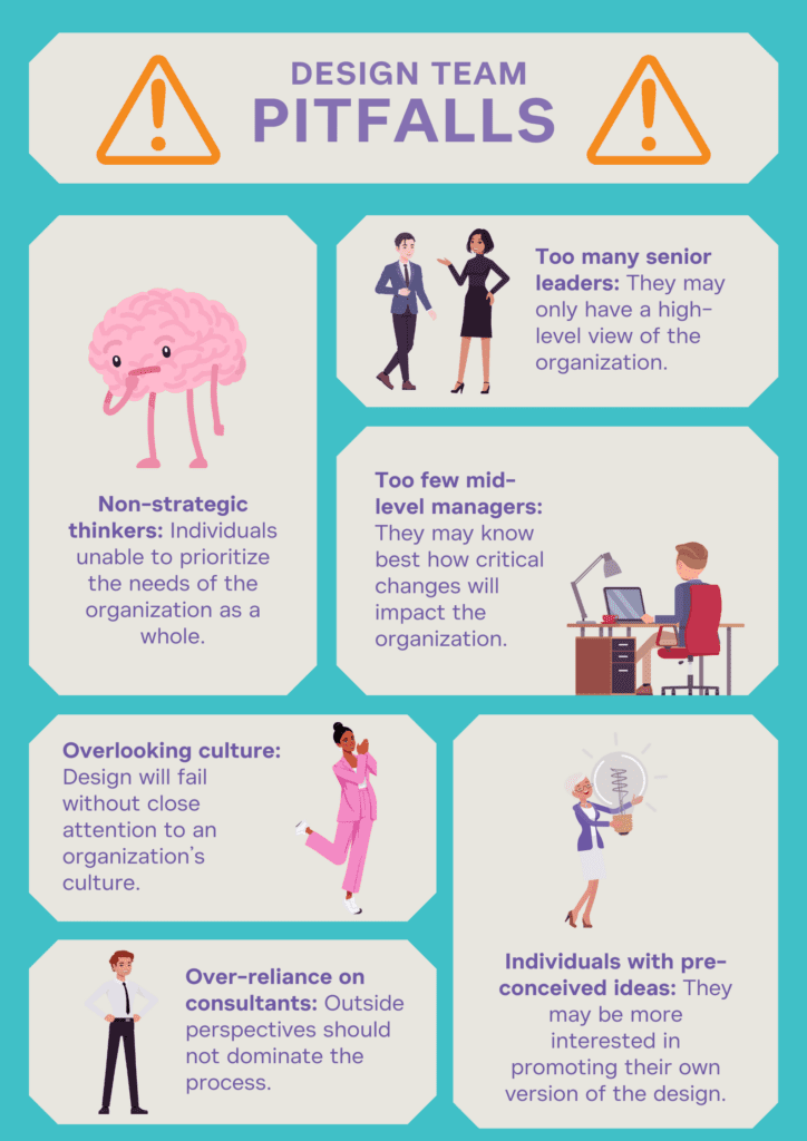 Sometimes people assume that changing structure will make everything else turn out fine. But that’s not really the case. Team members need to think about the organization’s culture, its communication systems, and so forth. Ensure you have people who can help bring all of these perspectives into the room. You really don’t want smart people who are great at organization design but who fail to understand the culture and communication needs.